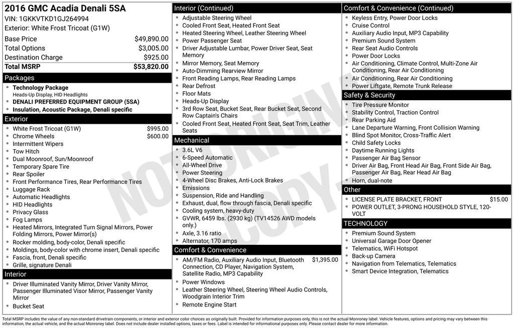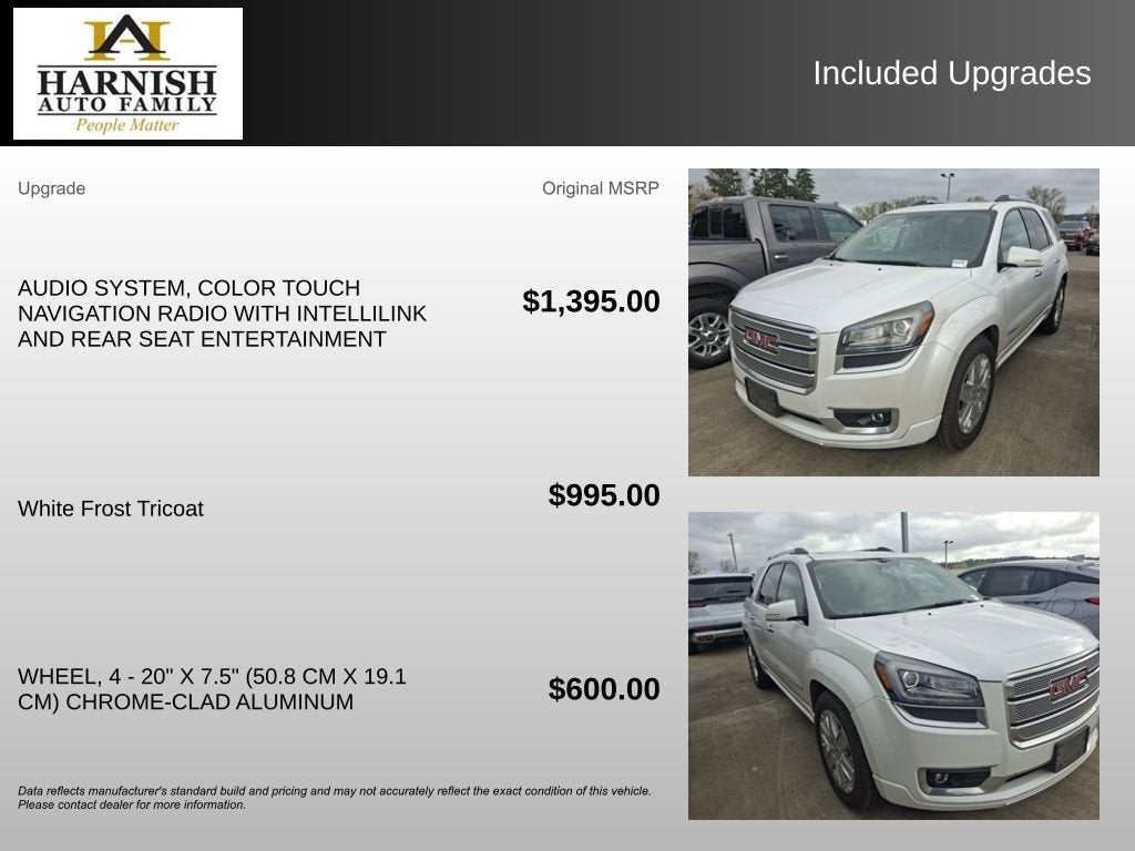 2016 GMC Denali AcadiaWhite Frost TricoatAWD15/22 City/Highway MPGExperience the Difference at Chevrolet of Puyallup. As one of the top dealers in the NW, we make it easy. With Care-Free Maintenance , No Worry Warranties, Accessory Discounts and the best Customer Rewards Program in the NW. 2016 GMC Acadia Denali {Exterior Color}Experience the Difference at Chevrolet of Puyallup. As one of the top dealers in the NW, we make it easy. With Care-Free Maintenance , No Worry Warranties, Accessory Discounts and the best Customer Rewards Program in the NW. With over 30 years of serving our communities transportation and service needs.AWD, Cocoa Dune Leather.Reviews:* Ride quality is smooth and compliant over most road surfaces; plenty of cargo capacity, even behind the third row; seating for up to eight passengers; earned top crash test scores. Source: EdmundsAwards:* 2016 KBB.com Brand Image Awards