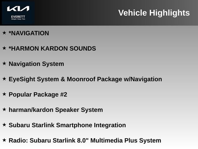 - Radio: Subaru Starlink 8.0" Multimedia Plus System -inc: AM/FM stereo HD Radio w/single disc CD player, multi touch gesture high resolution 8.0" LCD display, voice activated controls, Bluetooth® audio streaming connectivity, Bluetooth® hands-free phone and text messaging connectivity, iPod control capability, SMS text messaging capability, SiriusXM All Access Radio, Travel and Travel Link (subscription required), dual USB ports, 3.5mm auxiliary input jack, 6 speakers, roof mounted audio and satellite antenna and and Android Auto and Apple CarPlay capability for compatible phones StarLink enrollment cannot be applicable to Fleet Management Companies (FMCs) or to Commercial fleet accounts at this time.