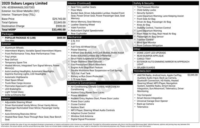 The 2020 Subaru Legacy Limited comes equipped with the following upgrades and options: