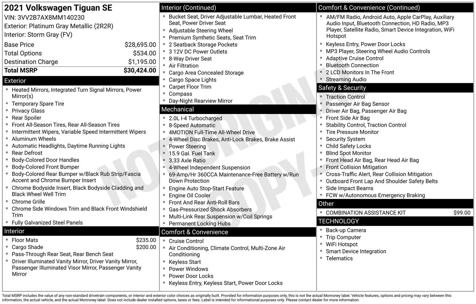 This is a 2021 Volkswagen Tiguan SE 4MOTION finished in Platinum Gray Metallic with Storm Gray leatherette interior, powered by the 2.0L TSI turbocharged engine and paired to an 8-speed automatic with Tiptronic and AWD. It currently shows 89,429 miles. Compared to many compact SUVs in this price range, this Tiguan stands out as a 1-owner local vehicle with documented service history and Volkswagen's 4MOTION all-wheel drive, which matters in wet Pacific Northwest conditions.