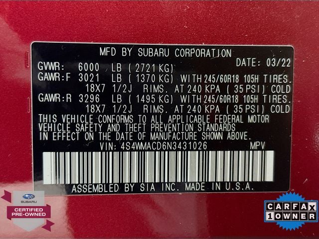 This Subaru Ascent Premium is not only well-equipped but also backed by the assurance of the Subaru Certified Pre-Owned program. With a 152-point inspection, Roadside Assistance, a $0 deductible Transferable Warranty, and a Powertrain Limited Warranty extending up to 84 months/100,000 miles, you can drive with confidence.