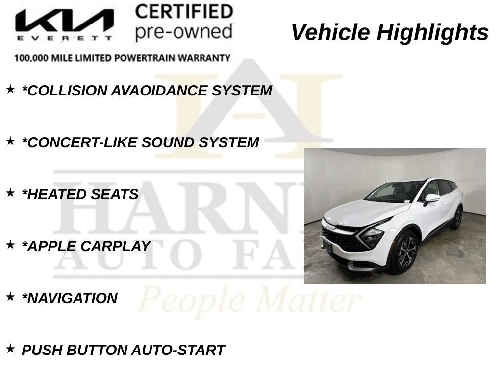 *KIA FACTORY CERTIFIED*, *LOW MILES, *ONE-OWNER, *EXCEPTIONAL CONDITION, *LUXURY OPTIONS, *BLIND SPOT MONITOR, *COLLISION AVAOIDANCE SYSTEM, *CONCERT-LIKE SOUND SYSTEM, *HEATED SEATS, *APPLE CARPLAY, *NAVIGATION, PUSH BUTTON AUTO-START, SAFE EXIT WARNING, Sportage EX, 8-Speed Automatic, Glacial White Pearl, Black Artificial Leather, Brake assist, Electronic Stability Control, Illuminated entry, Security system, Steering wheel mounted audio controls, Turn signal indicator mirrors.