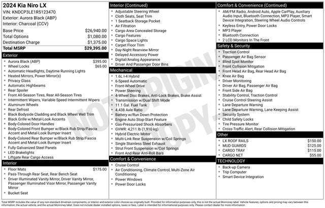 2024 Kia Niro 1.6L I4 DGI Hybrid DOHC 16V LEV3-SULEV30 LX Aurora Black