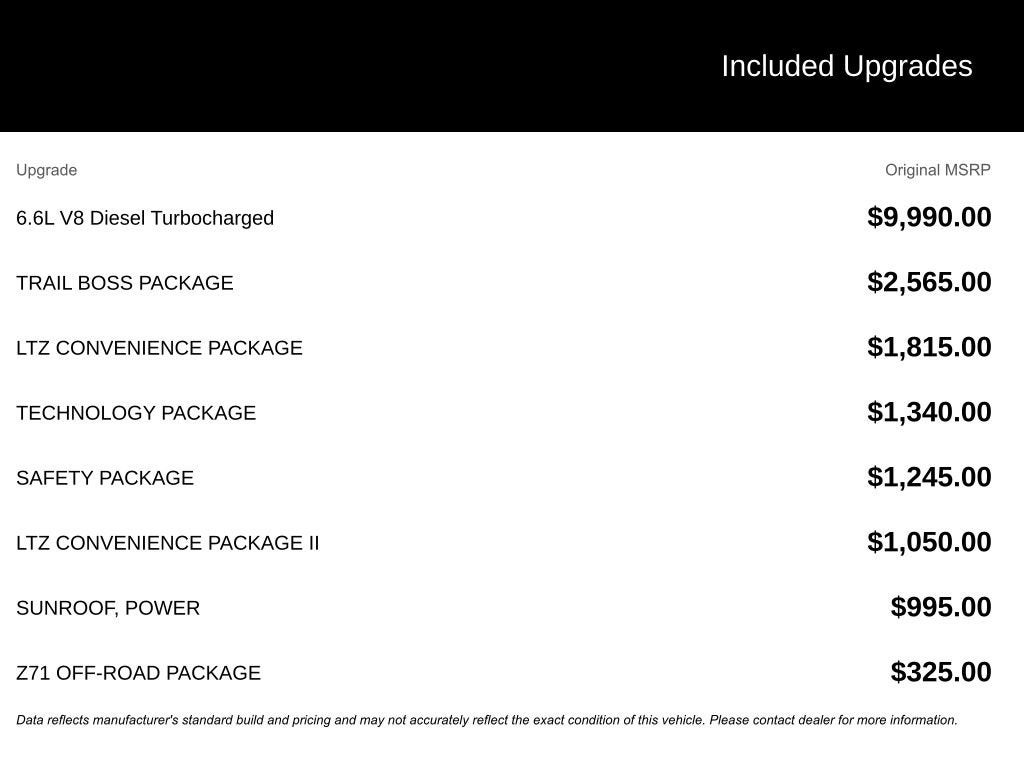 This Silverado 2500HD LTZ is exceptionally well equipped with premium factory upgrades that elevate both capability and comfort. Highlights include the Duramax 6.6L turbo-diesel V8 paired with the Allison 10-speed automatic, LTZ Convenience Packages I and II, Technology Package with head-up display and rear camera mirror, Safety Package with HD surround vision and trailer safety features, Z71 Off-Road Package, power sunroof, Trail Boss appearance elements, and Chevytec spray-on bedliner. These options deliver serious towing confidence, advanced technology, and upscale refinement.